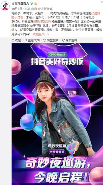作为抖音平台人气主播,晨妍受邀参加了抖音官方推出的“美好奇妙夜”活动。在直播中和粉丝们来了一场近距离互动,分享了许多趣事,通过此次直播,粉丝们也看到这位穿搭达人多才多艺的一面。