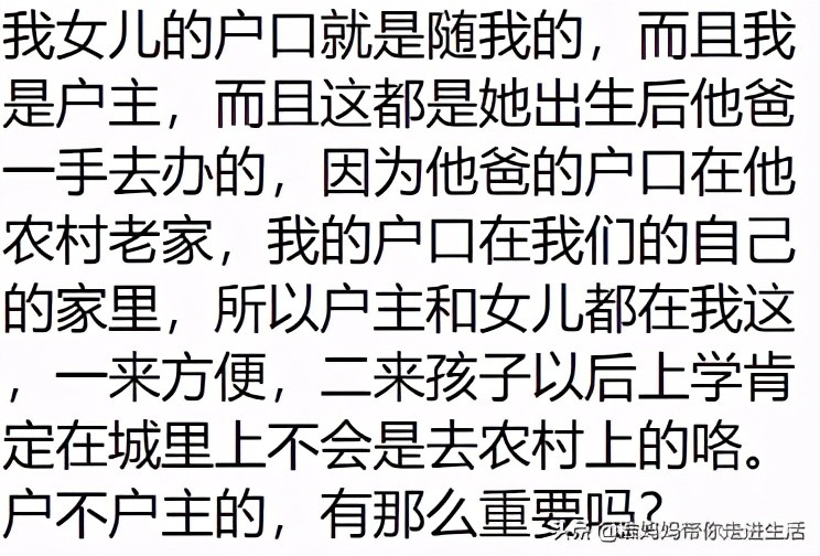 我是女方,我孩子户口跟着我在娘家呀,户口什么的有什么关系,大清早亡了啊,我以为全天下都是只要对孩子好就可以了,何况是户口这么虚头巴脑的东西,他们真的爱自己的孙子吗