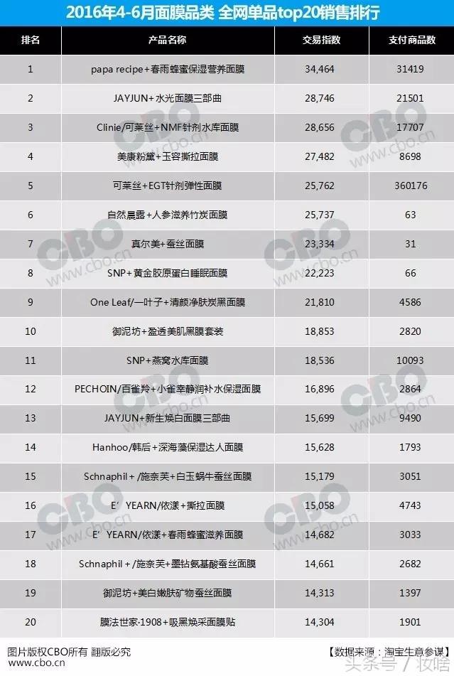 你们以为国货很辣鸡吗?才不是,在全网面膜品牌TOP20中,国货有9个品牌进入榜单,和韩系品牌展开激烈角逐。上榜国货有:御泥坊、美康粉黛、一叶子、膜法世家、韩后、芬迪翡丽、百雀羚、施奈芙、安安国际。