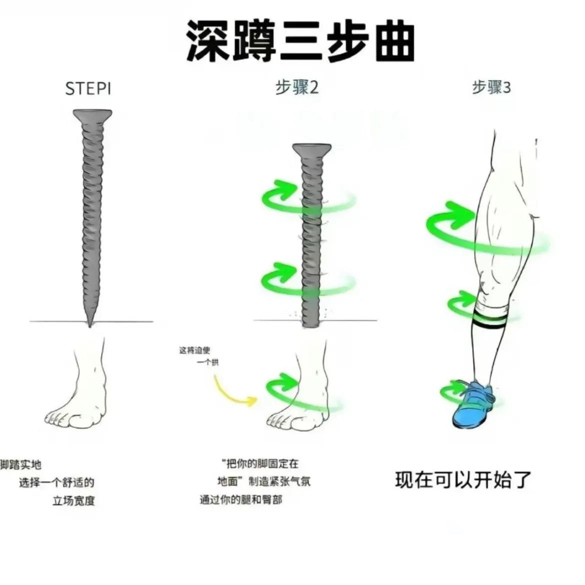 1. 姿势准备:站立时双脚与肩同宽或稍宽,脚尖稍微外扣,双手可以放在胸前或放在脑后。