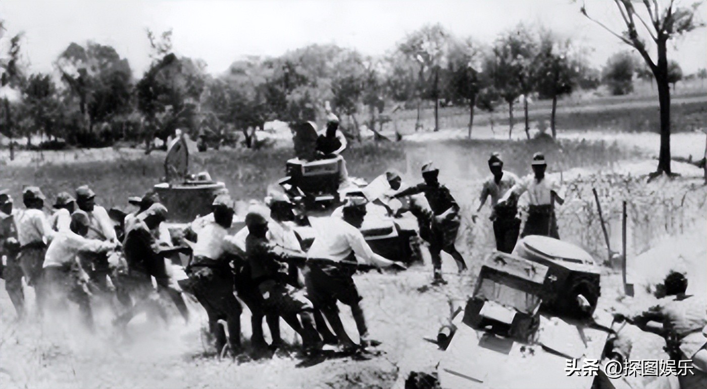 04.1938年黄河大决堤照片,人们都在合起伙来拉绳子。