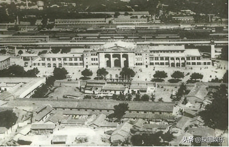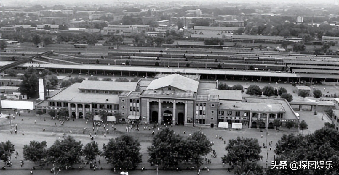 02.1959年郑州火车站,中间的一排小屋是公共汽车调度室,图中近景处看似民房,实则餐馆、百货店。