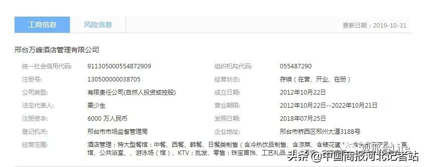 邢台万峰酒店管理有限公司于2012年10月22日在邢台市工商行政管理局登记成立。法定代表人王贵军,公司经营范围包括特大型餐馆:中餐、西餐、韩餐、日餐类制售(含冷热饮品制售等)。