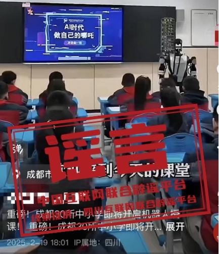 网传视频中的机器人授课画面出自2月17日“直播绵阳”发布的“绵阳造机器人主讲开学第一课”的视频内容。原视频中,机器人出现在课堂,是为参与“开学第一课”相关的展示活动,并非日常教学。(来源:四川互联网举报辟谣平台)