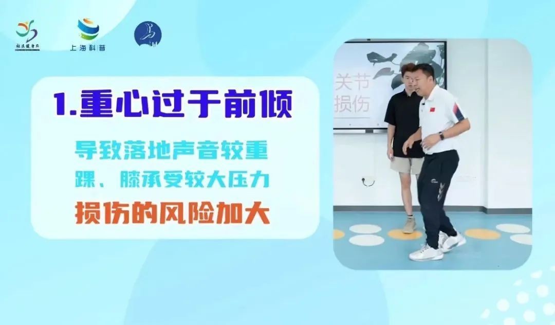 重心过于前倾:导致落地声音较重,踝,膝承受较大压力,可能会产生膝前痛、跟腱痛、足底筋膜炎等问题。