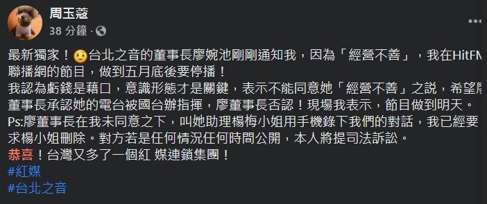 【世界观news讯】周玉蔻日前因抢先台湾指挥中心公布案例人数,行为遭疑不妥,而她于2012年起每周1至周5在Hit Fm主持节目《周玉蔻呛新闻》,稍早在脸书自爆被通知停播, “台北之音的董事长廖婉池刚刚通知我,因为经营不善,我在Hit Fm联播网的节目,做到五月底后要停播!”