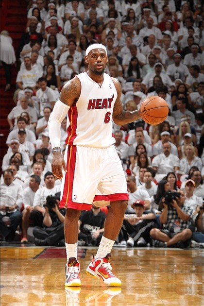 到了 2011-2012 赛季,这是一个停摆缩短的赛季,詹姆斯携手队友带领热火队取得了 46 胜 20 负的战绩。这个赛季他在常规赛的表现更为亮眼,场均数据来到了 27.1 分 7.9 篮板 6.2 次助攻,并且荣获常规赛 MVP。他加强了自己稳定的三分投射以及背身单打能力,这让他在进攻端的选择更加多样化,对手愈发难以对他进行针对性防守,能够更有效地撕开对手防线,为队友创造机会或者自己直接得分,全面带动起球队的进攻节奏,使得热火队在常规赛阶段就展现出了强大的争冠实力。