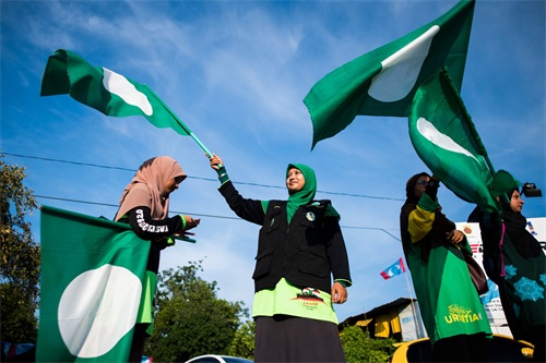 2018年5月,第14届大选前一天,马来西亚伊斯兰党支持者在路边挥舞旗帜。