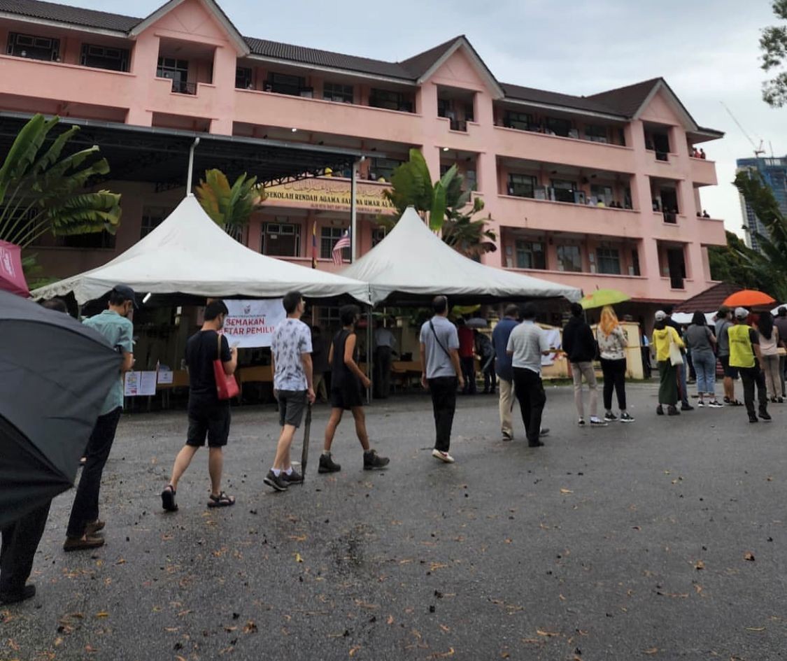 11月19日中午,选民在马来西亚柔佛州新山市一个投票点外等待投票。摄影:Amyra