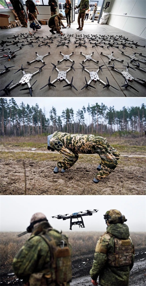 上图:2024年9月13日,乌克兰利沃夫,乌克兰一个志愿者组织向军队供应50架FPV无人机。 中图:2025年1月29日,乌克兰基辅,乌克兰武装部队设计的战争机器狗。