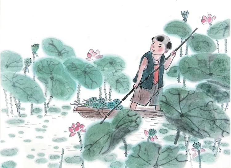 看这小娃娃,一个人撑着小船,偷偷地去采了白莲。回来时,只顾着开心了,却忘了掩藏踪迹,在水面的浮萍上留下了一条船儿划过的痕迹。