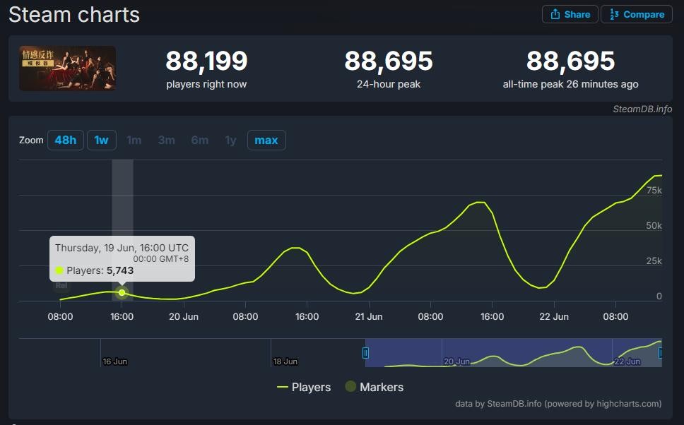上线当日,游戏定价33元,首发期间打折至29.04元。这个价格远低于同类互动影游(通常在52—68元区间)。而据游戏官方透露,这款游戏至少需要卖出37万份才能回本。但仅仅上线5天,游戏销量突破68万份,登上国区热销榜第一,全球排名一度冲进前三。