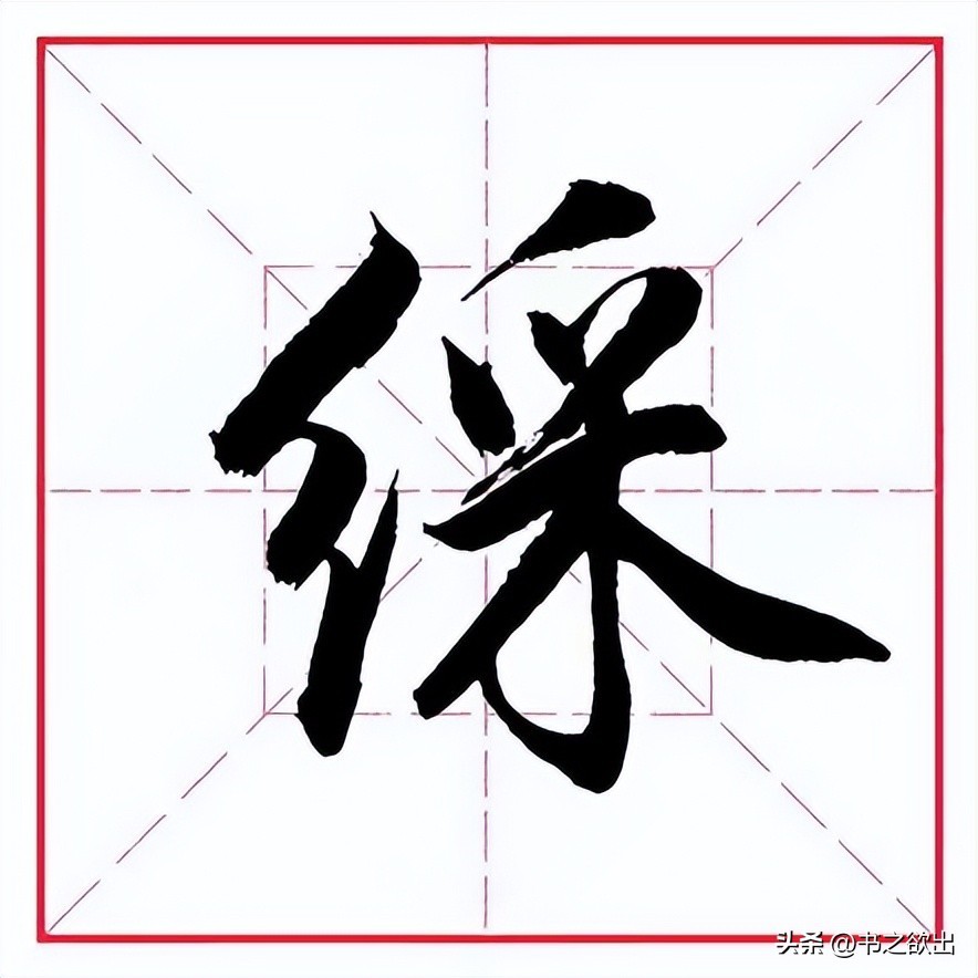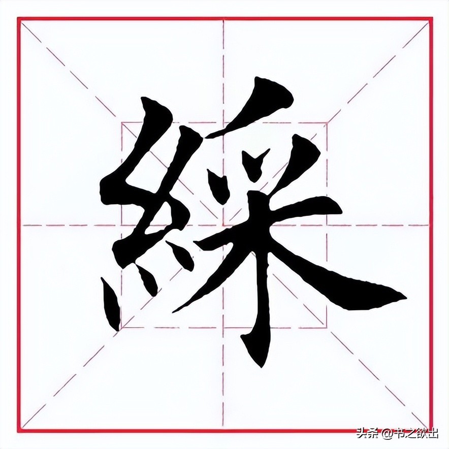 右部三个撇笔的起笔角度以及行笔走向皆有不同,切忌联排。首撇稍重,角度稍平;第二撇位于首撇的正下方起笔,短促有力;最后的撇笔起笔位置稍靠右,撇身略长。