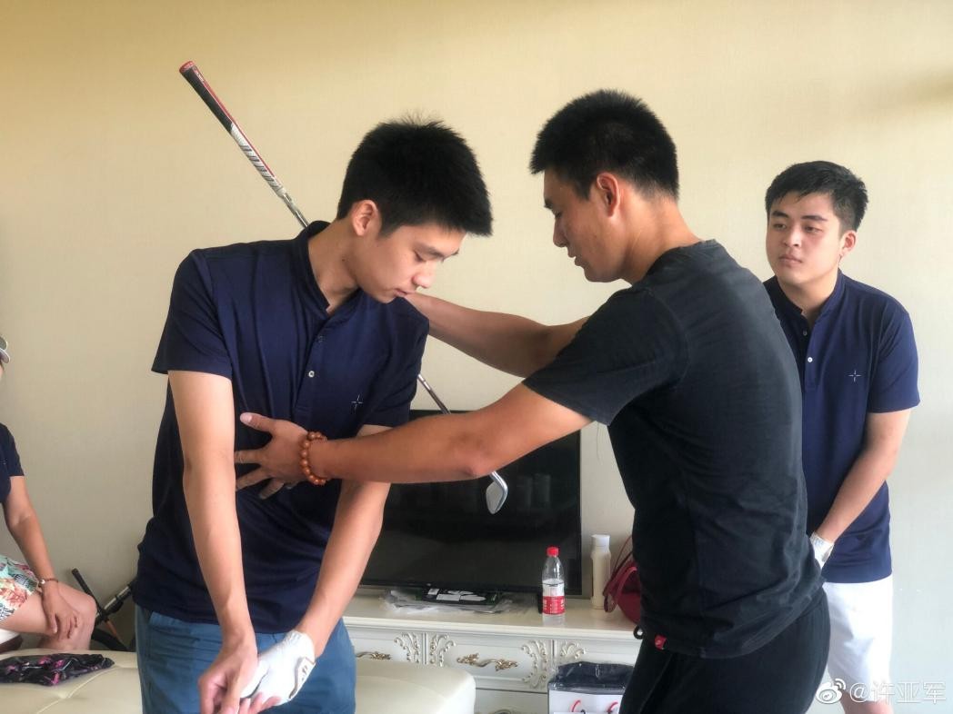 大儿子则是穿着黑色短袖,正在学习打高尔夫的专业姿势。从他的侧脸可以看出是一个大帅哥,五官轮廓特别立体,身材也很好,看来他是将爸爸妈妈的优点完美的结合了。