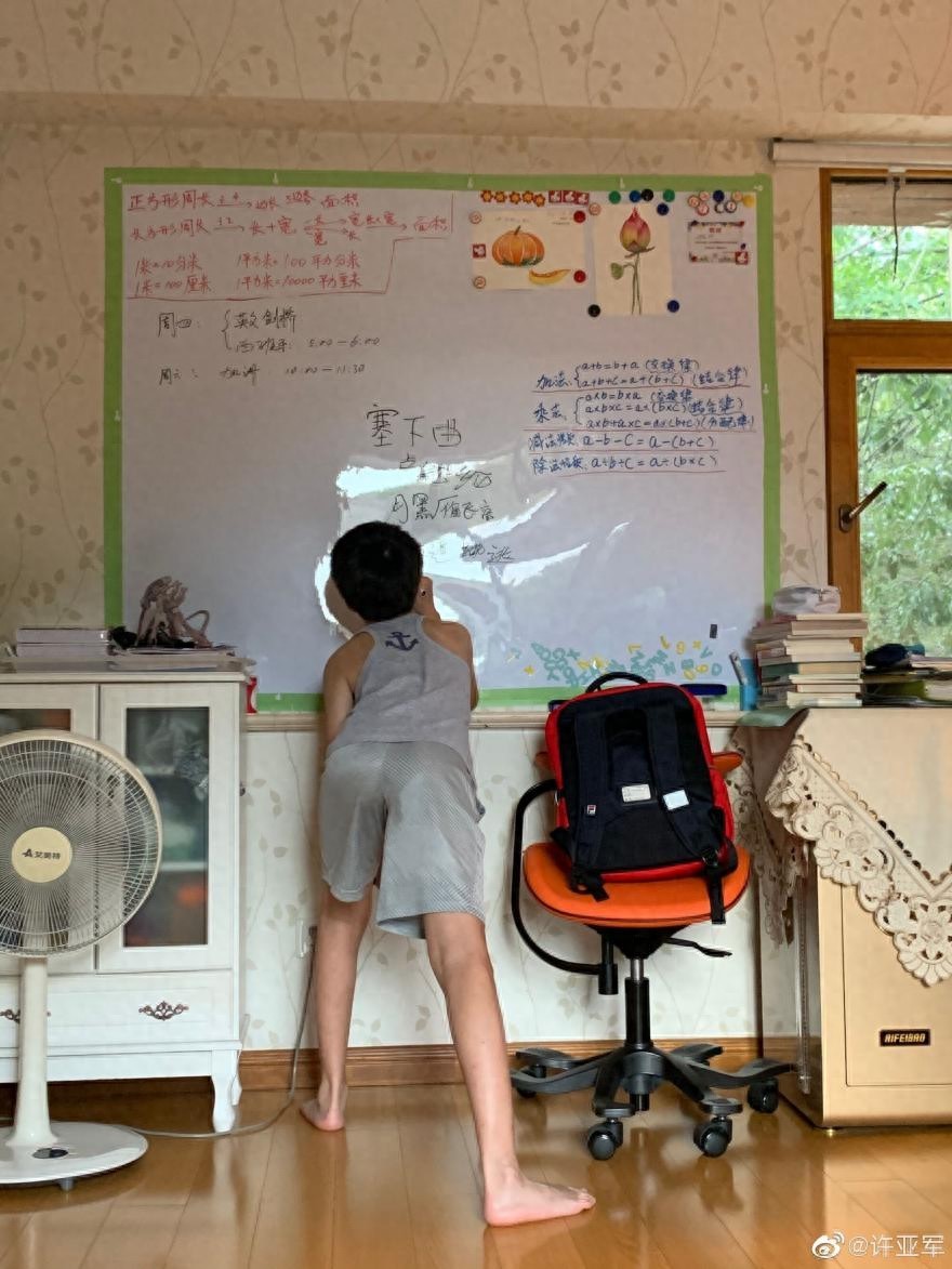 8月28日晚上,老戏骨许亚军在社交平台上又晒了自己的孩子,他发文说:"要开学了。"在第一张照片中,小儿子正对着黑板奋笔疾书,似乎正在默写古诗《塞下曲》,看来从小就是学霸。