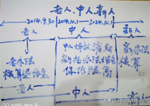 “老人”是2014年9月30日以前已退休人员,“中人”是2014年9月30日及以前参加工作、十年过渡期内退休的人,“新人”是2014年10月1日及以后参加工作,2024年10月以后退休的人。