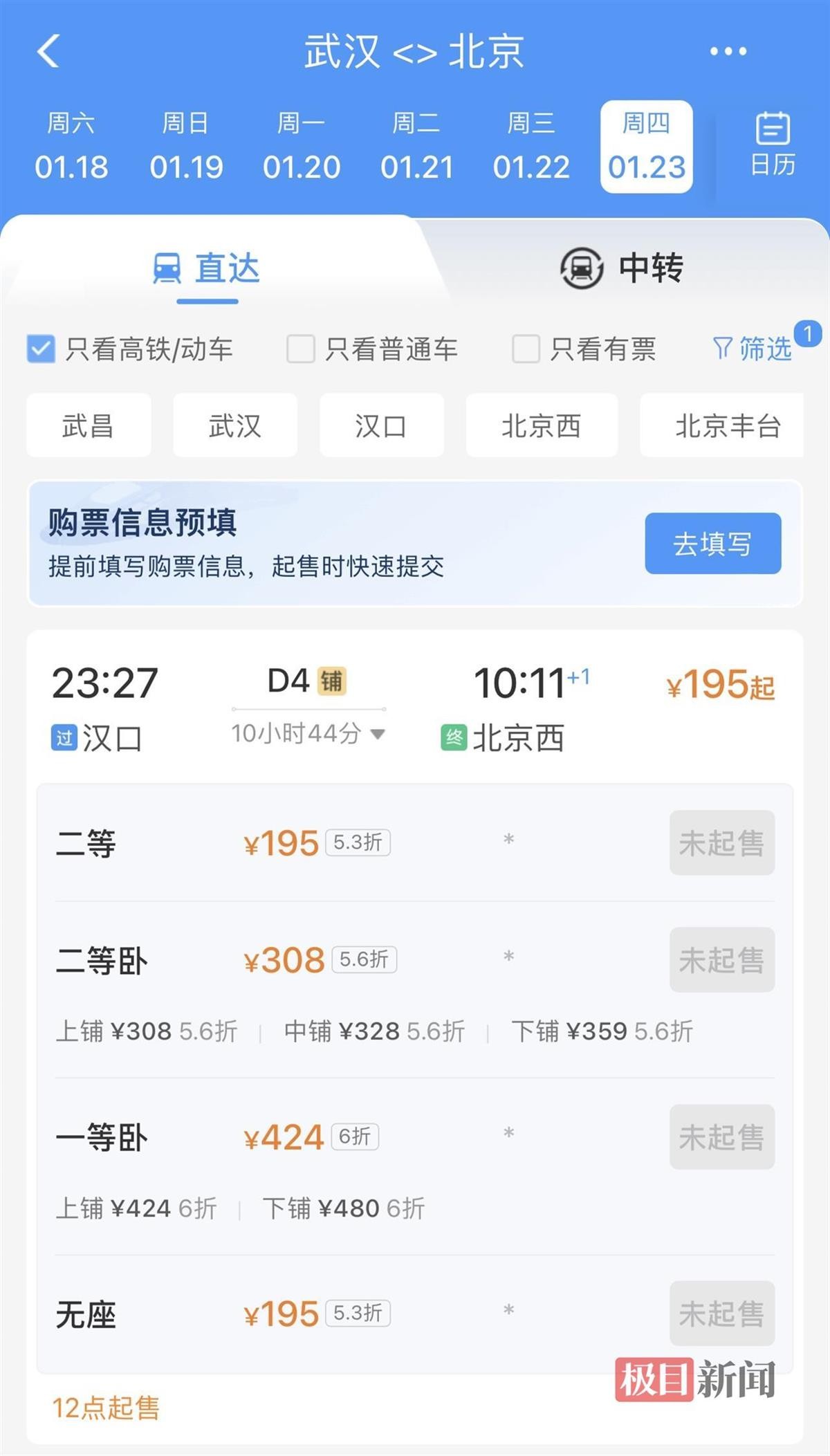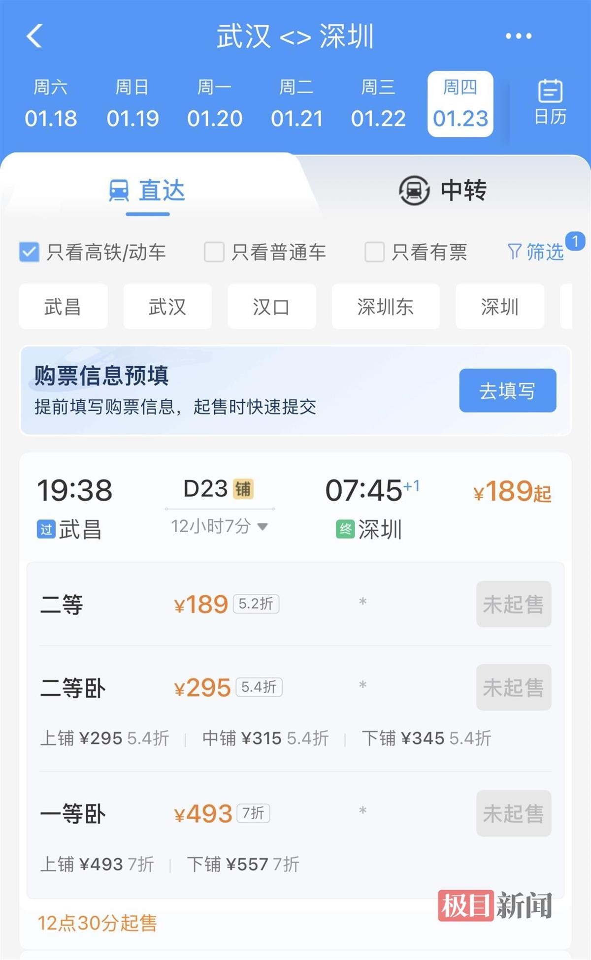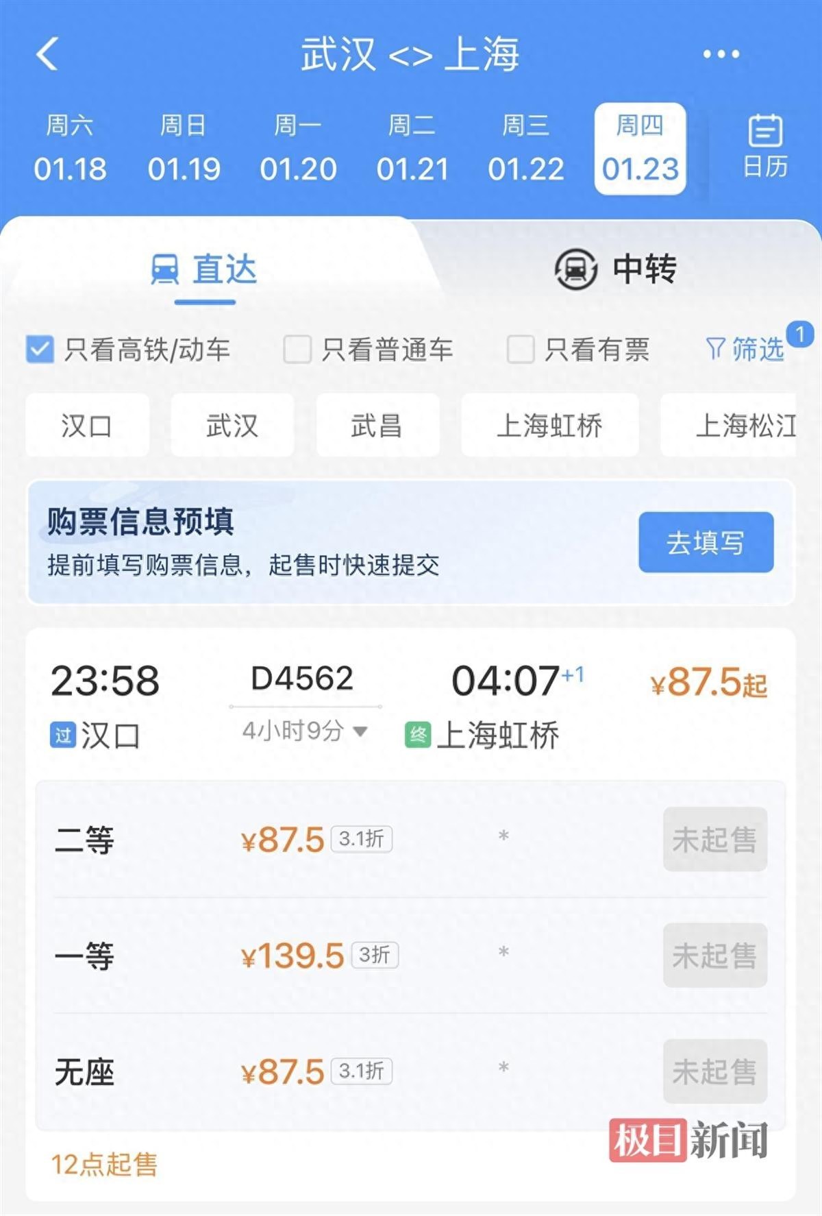 1月9日,极目新闻记者在12306售票页面看到,1月23日,汉口到上海虹桥的D4562次列车二等座仅需87.5元,折扣幅度为3.1折。23:58出发,次日4:07抵达上海虹桥。