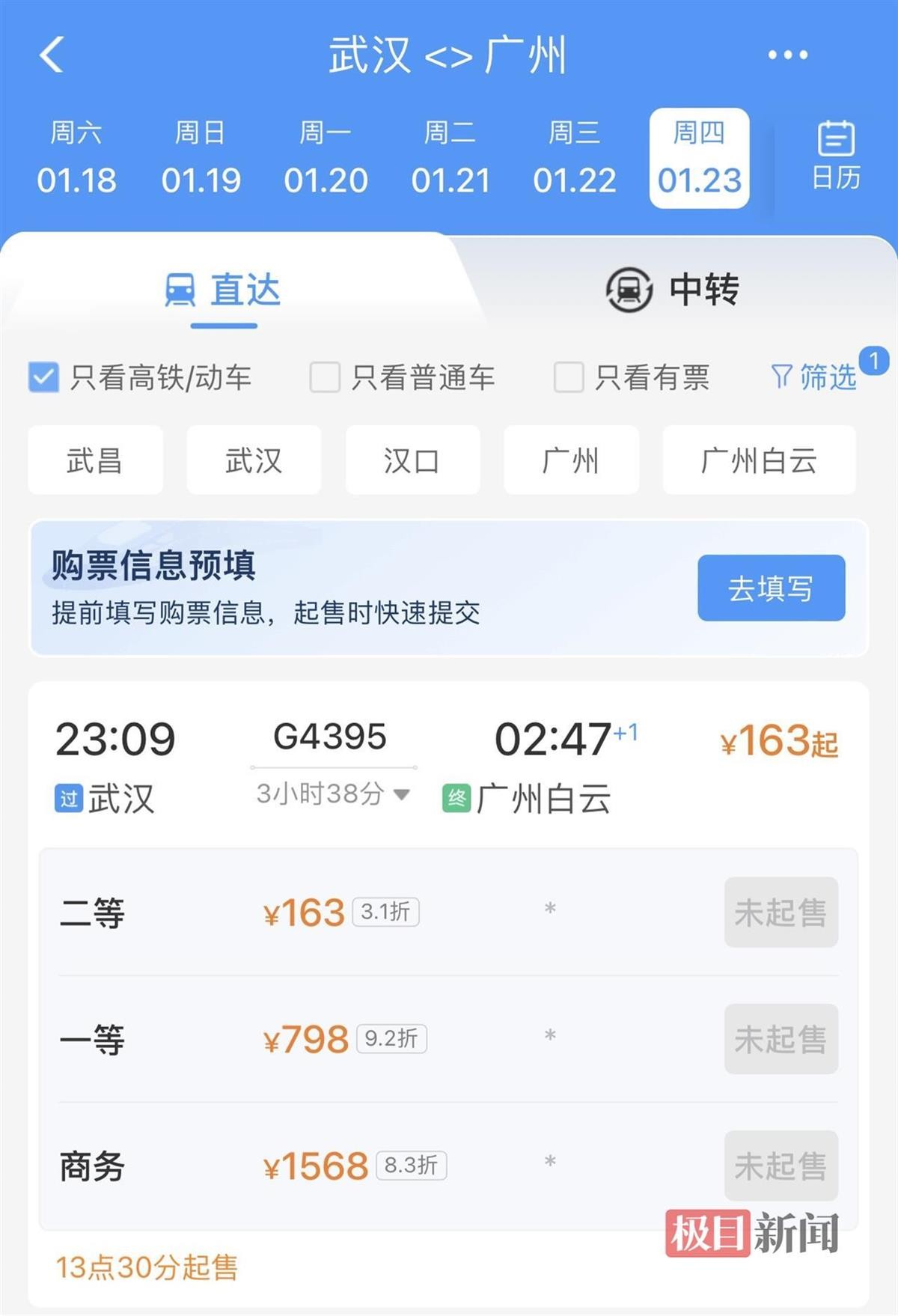 除此之外,还有不少D字头车票也在优惠打折。在1月23日,武汉-广州白云的G4395次,二等座163元,3.1折;武昌-深圳D23次,189元起,5.2折;汉口-北京西的D4次,195元起,5.3折。