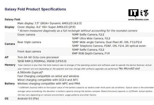 三星可折叠屏手机Galaxy Fold详细参数配置表 屏幕处理器介绍