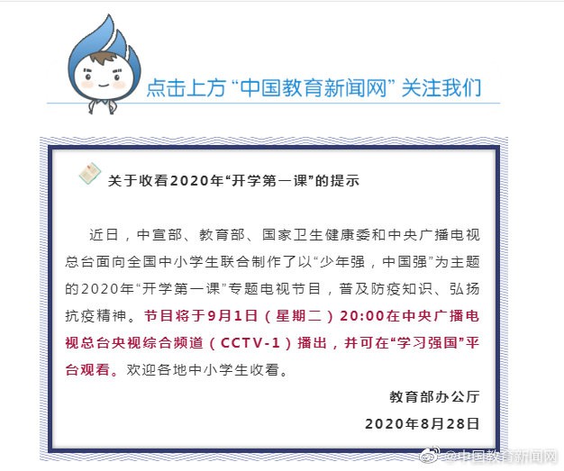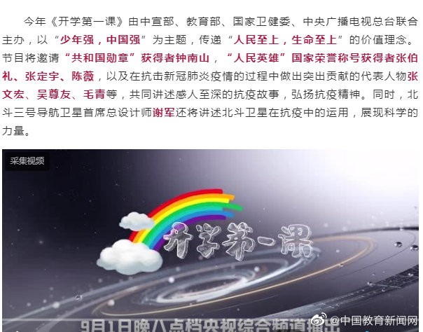 九月开学季 这堂课注定难忘! 【2020年《开学第一课》9月1日正式播出,钟南山携手“抗疫英雄”开讲“少年强,中国强”】今年,《开学第一课》以“少年强,中国强”为主题,传递“人民至上,生命至上”的价值理念。节目将邀请“共和国勋章”获得者钟南山,“人民英雄”国家荣誉称号获得者张伯礼、张定宇、陈薇,以及在抗击新冠肺炎疫情的过程中做出突出贡献的代表人物张文宏、吴尊友、毛青等,共同讲述感人至深的抗疫故事,弘扬抗疫精神。同时,北斗三号导航卫星首席总设计师谢军还将讲述北斗卫星在抗疫中的运用,展现科学的力量。《开学第一课》节目将于9月1日(星期二)20:00在中央广播电视总台央视综合频道(CCTV-1)播出,并可在“学习强国”平台观看。文章来源:本文由中国教育新闻网综合自教育部网站,开学第一课微信号(cctvkxdyk) 开学第一课 教育