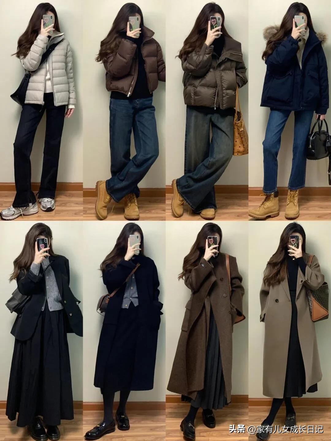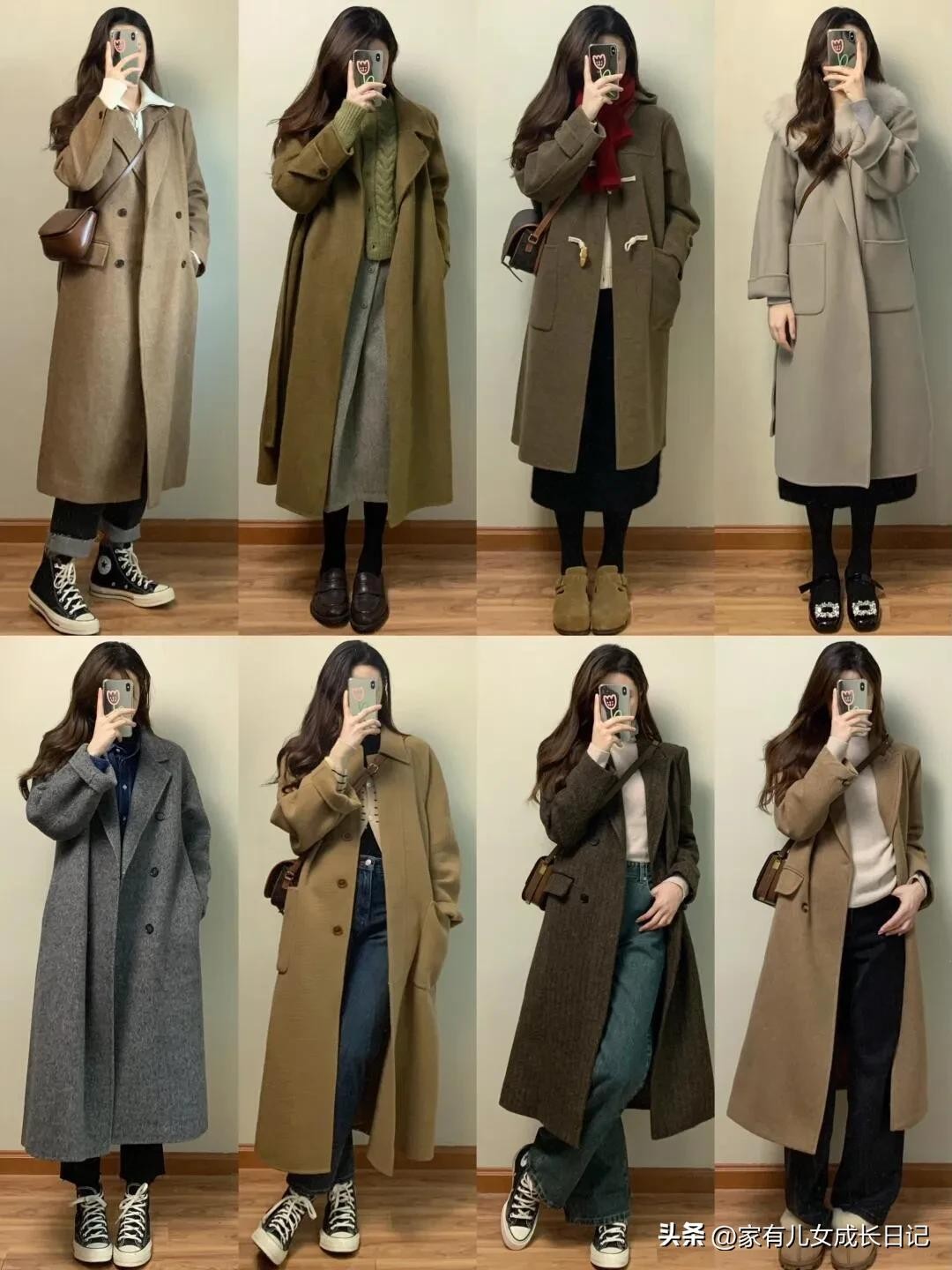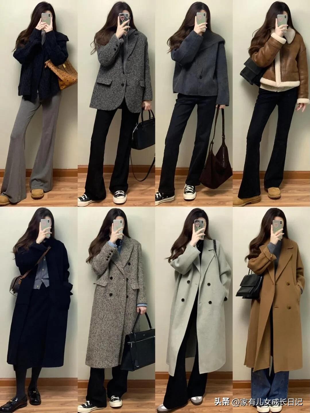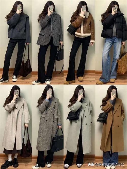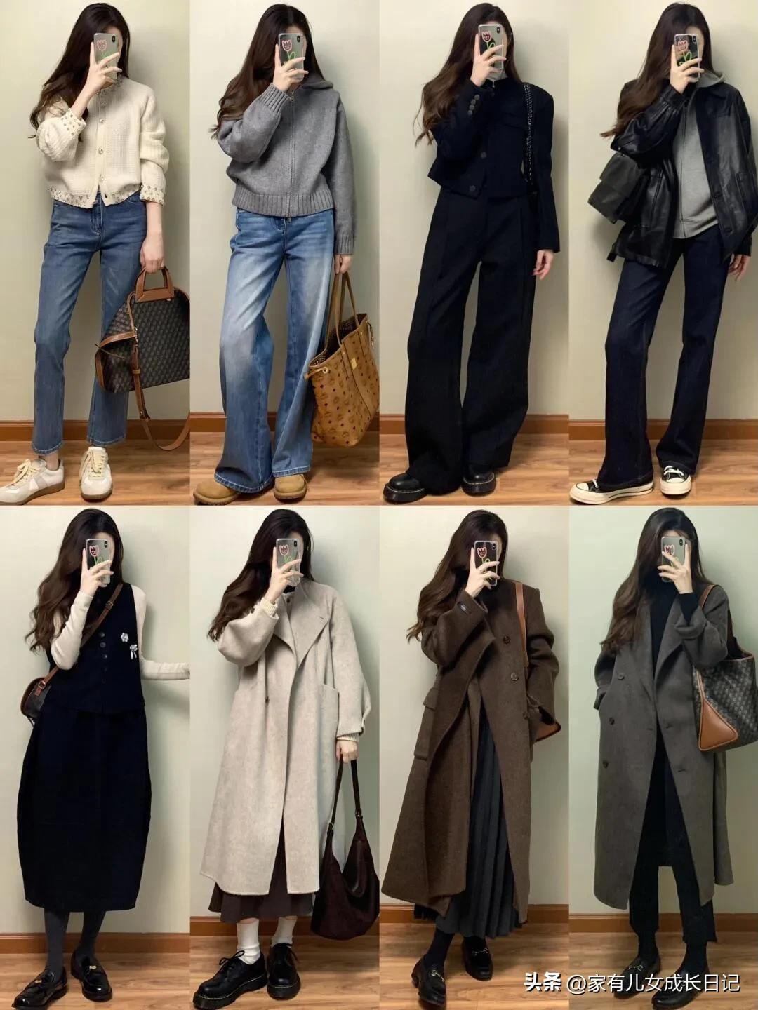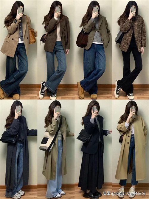 时尚女人128套穿搭,咖、灰色系毛呢大衣+牛仔裤,优雅通勤高级感