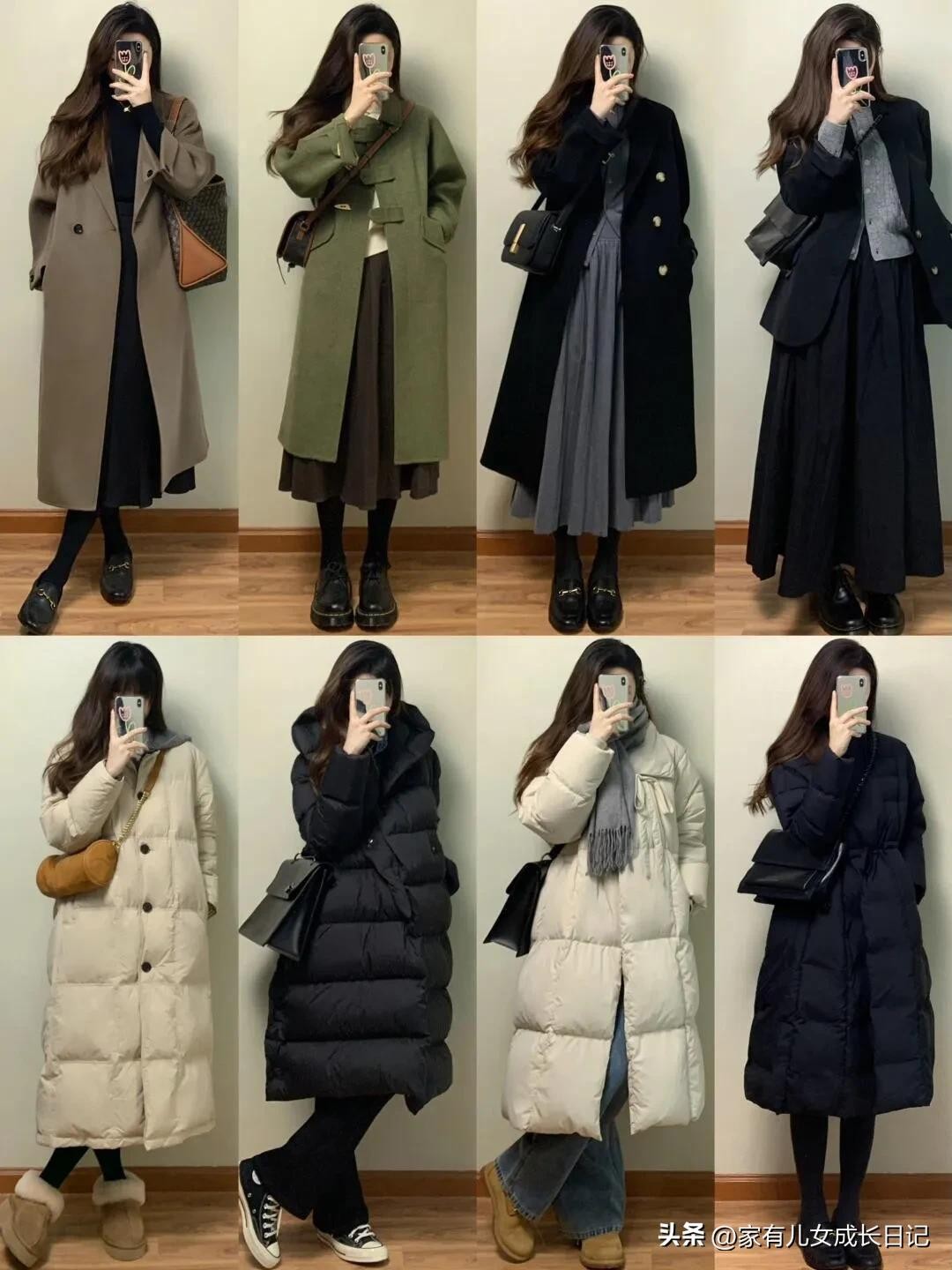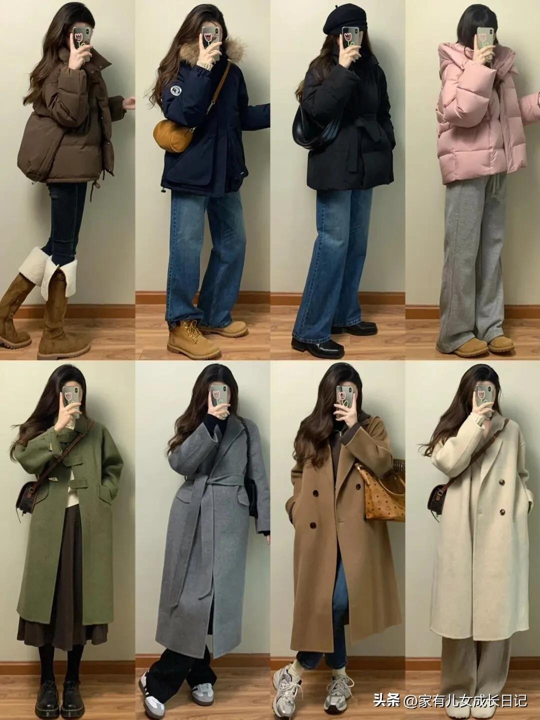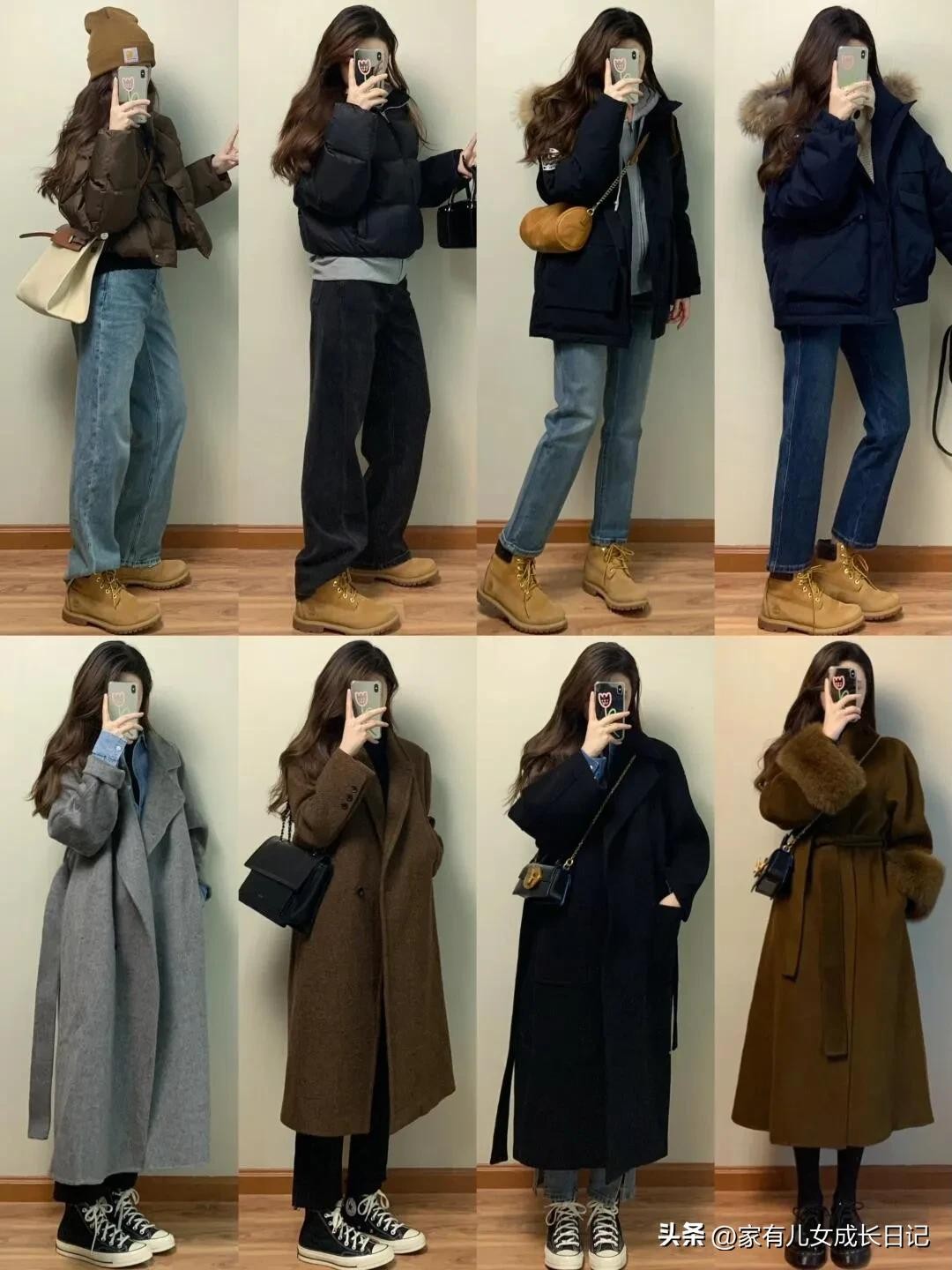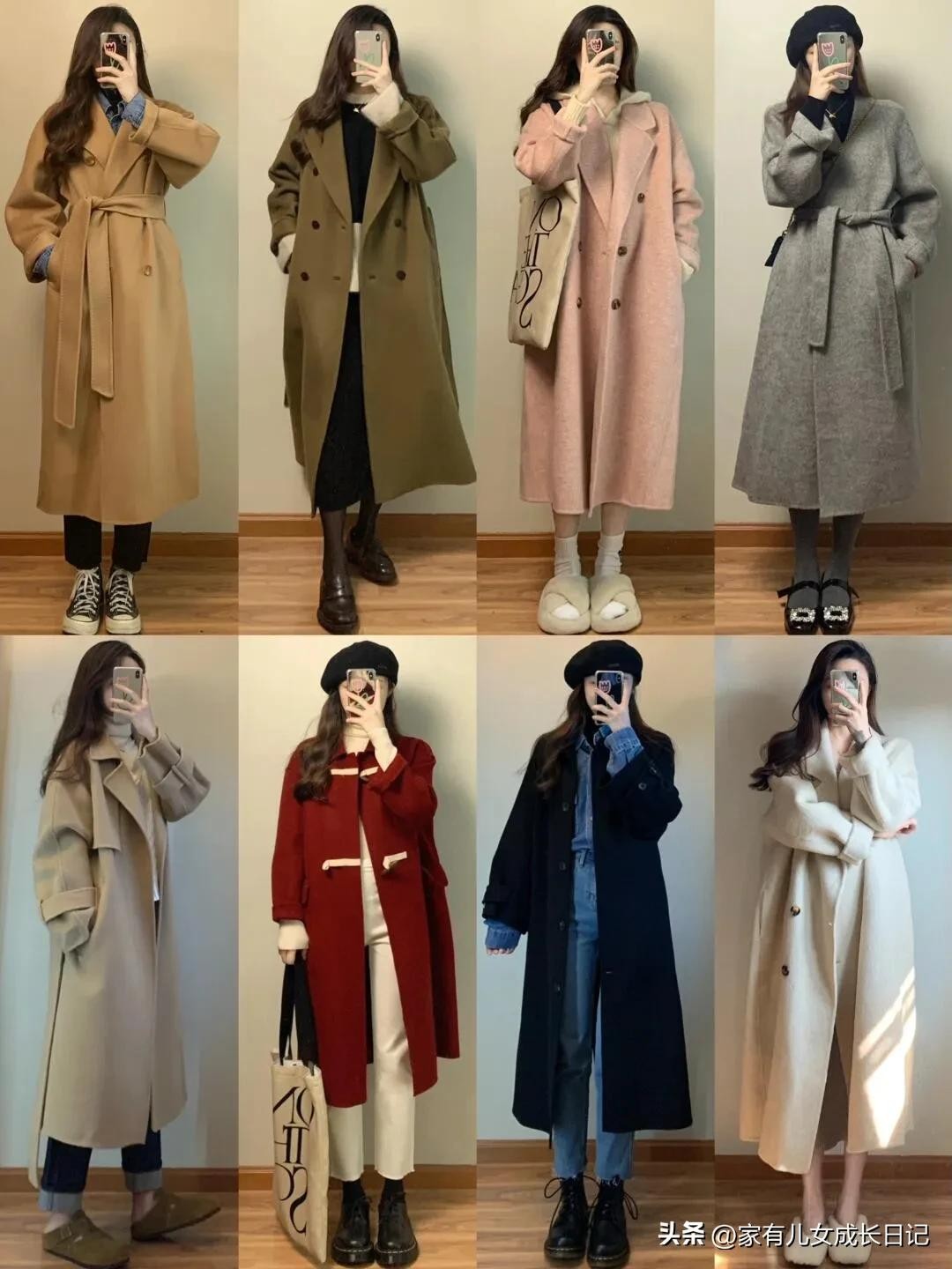 时尚女人128套穿搭,咖、灰色系毛呢大衣+牛仔裤,优雅通勤高级感
