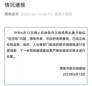 - 文旅局局长妻子“吃空饷”?官方通报 6 月 14 日凌晨, 渭南发布 发布情况通报: 针对 6 月 12 日网上反映我市文旅局局长妻子疑似 吃空饷 问题,渭南市委、市政府高度重视,已成立由...