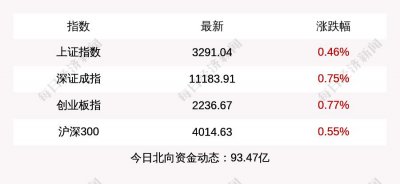 - 沪指收盘上涨 0.46%,创业板指上涨 0.77%,北上资金当日净流入 93.47 亿元