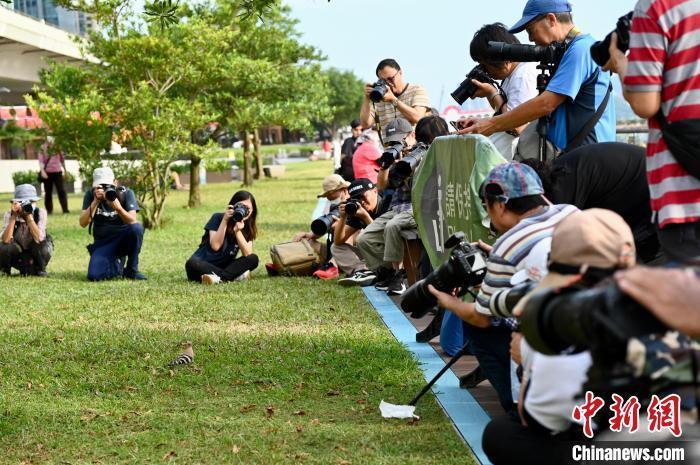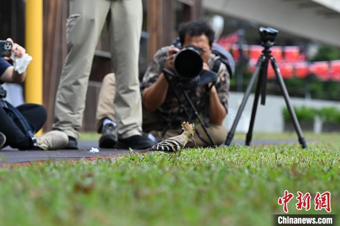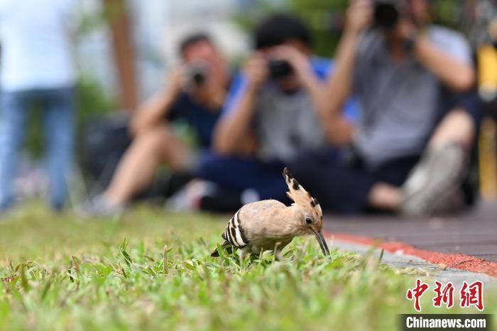 10月13日,一只戴胜鸟在香港观塘海滨花园的草地或树上逗留及觅食,吸引大批摄影爱好者到场守候拍摄。现场的戴胜鸟并不惧怕场内的人,如模特般任由摄影爱好者拍摄。有雀鸟专家指戴胜鸟每年都会过境香港,喜欢在草地停留。专家呼吁市民与之保持距离,尽量不要干扰其作息。(记者 李志华)