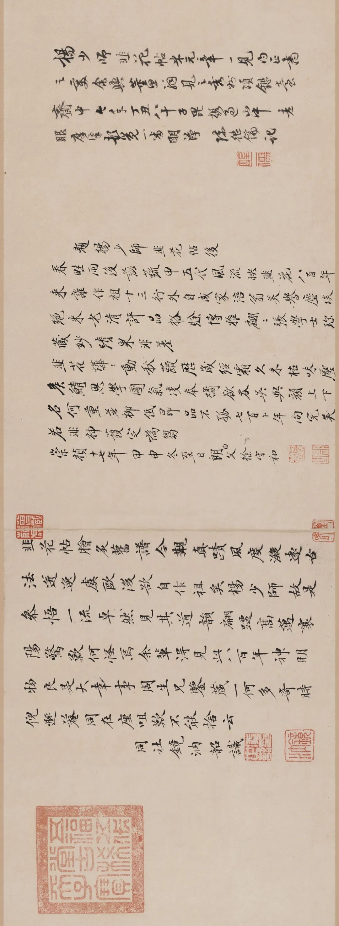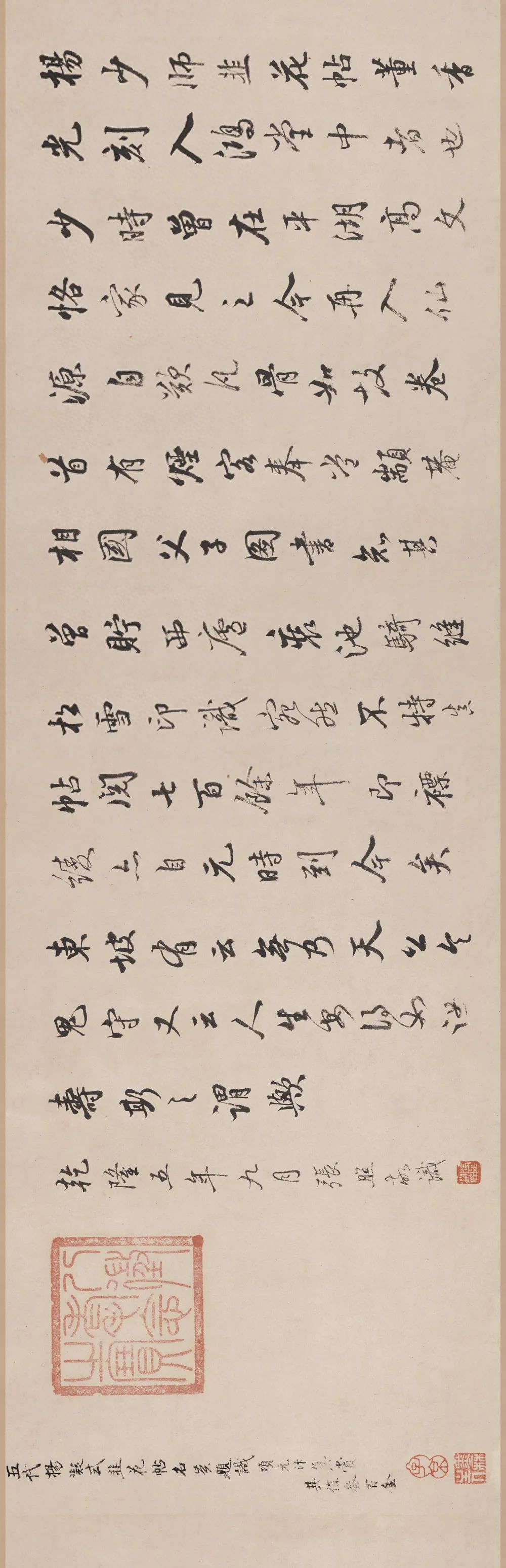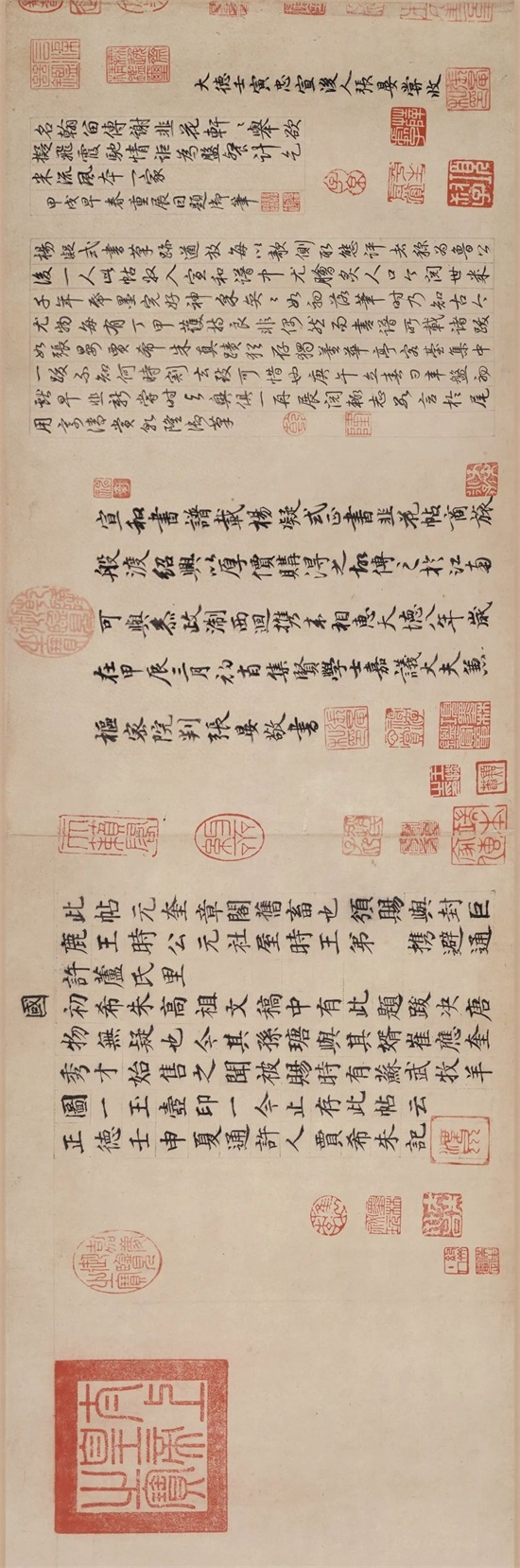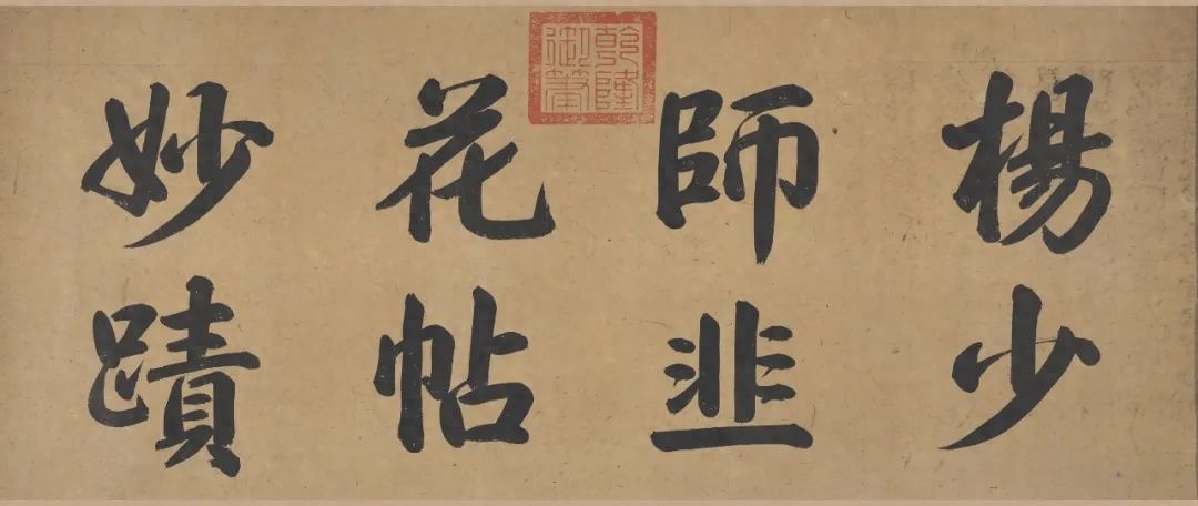 杨凝式《韭花帖》清乾隆内府藏本,行书,墨迹麻纸本,五代,高26厘米,宽28.5厘米,全卷393厘米,共7行63字,被称天下十大行书之一,排第五,无锡博物院藏。《韭花帖》是杨凝式醒后饥饿无比,得韭花珍馐而食,心中惬意故灵感大发写下。