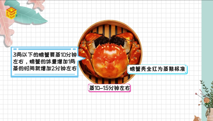 蒸螃蟹用开水下锅需蒸10-15分钟左右,以螃蟹壳全红为蒸熟标准,蒸制时间与螃蟹的大小也有关系。3两以下的螃蟹要蒸10分钟左右,螃蟹的体重增加1两,蒸的时间就增加2分钟左右,以此类推,就能知道整只的螃蟹要蒸多长时间。此外,切块的螃蟹蒸的时间要短一些,一般10分钟就可以蒸熟。