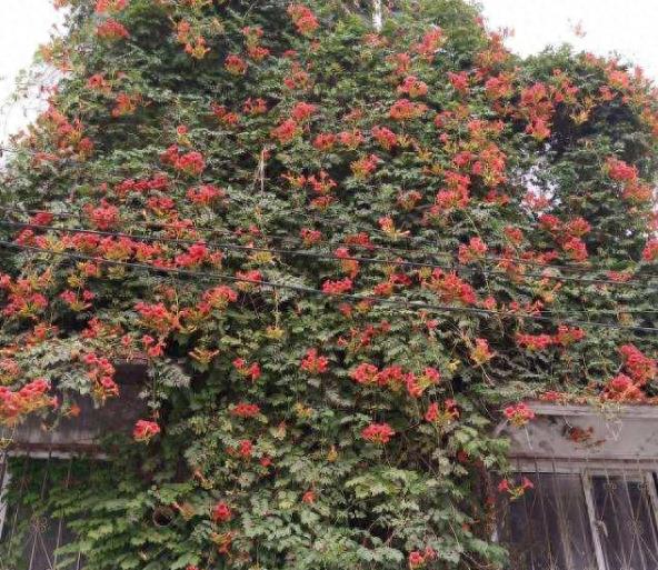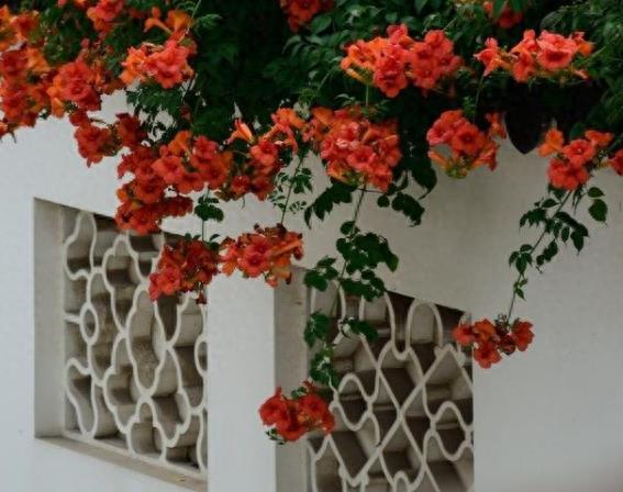 凌霄花是比较优秀的爬藤植物,耐寒、喜光,皮实好养,种在院墙外,冬天零下20度也冻不死,花期也很长,从夏天可以一直开花到深秋。