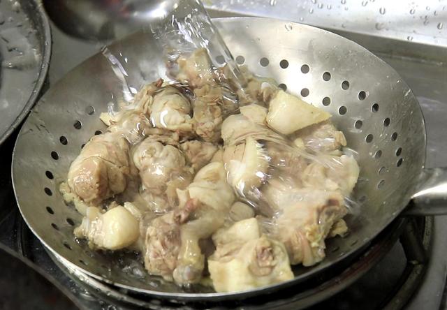 4.锅内烧水,末伏吃什么水果好,把鸭块倒入笊篱中控干水分,加入少许食盐入底味,料酒10克去腥,把鸭块冷水放入锅中,轻轻推动让其均匀受热,鸭块冷水下锅会慢慢的析出养生血水。水烧开以后打去锅中的浮沫,焯水2分钟左右捞出,用清水冲洗干净,控水备用。