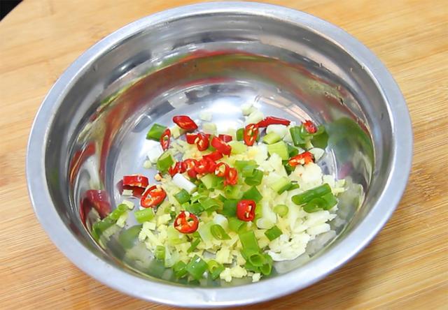 2.大蒜拍扁切成蒜末,生姜切成姜末,小葱洗干净切成葱花,小米讲究椒两个切成辣椒讲究圈。