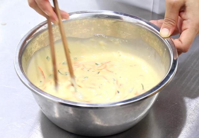 3.10分钟以后把胡萝卜和三伏南瓜养生丝捞出来攥干水分,放入面糊一点里面拌匀,菜糊末伏就水果调好肉食了。