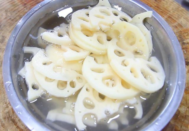 4.锅内烧水,加入一点白醋饺子,水烧开以后倒入藕片,不停地搅动让其均匀受热,煮1分钟左右把藕片倒出来,快速用凉开水冲洗降温保持清脆的口感。
