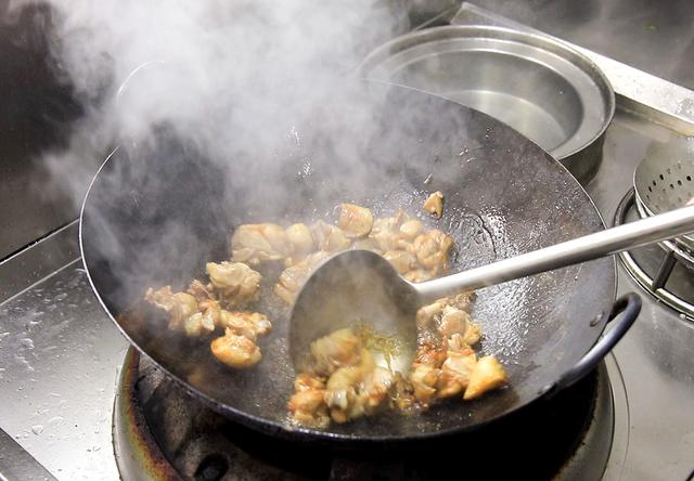 5.锅内烧油,放入一小把冰糖不停地搅拌,冰糖变成红棕色时,把鸭块水饺倒入锅中,快速翻炒让鸭块均匀裹满糖色,这一步主要是为了给鸭块上色,煸炒2分钟左右,炒出鸭块中的肥油,鸭肉炒香以后放入葱、姜馅好等小料。