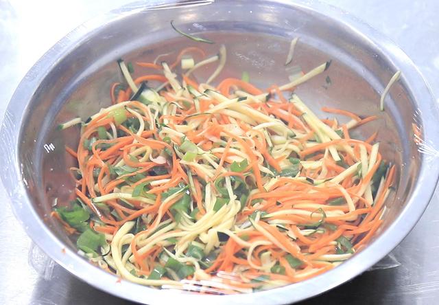 1.准备南瓜半个,削去外皮切成馅好细丝;胡萝卜半个,同样切成细丝,都放在盆中,加入适量的葱花,末伏吃什么馅水饺好,食盐2克吃,用筷子搅拌均匀,用保鲜膜盖住腌制10分钟,杀出胡萝卜和南瓜丝中的水分,以免烙制的时候出水。