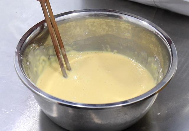 2.准备适量的小麦面粉放入盆中,打入三个鸡蛋,加入少许清水,顺着一个方向搅拌至没有面疙瘩,再次加入适量的清水,调成拿起筷子面糊不会粘在上面就可以了。