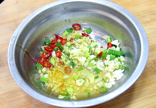 3.锅内烧油,油温烧至七成热时起锅,把热油浇在准备好的北方人末伏小料里面水饺包子,把葱姜蒜的香味激发出来。