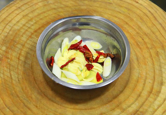 3.准备生姜一块切成片,葱白一段切成马蹄片,大蒜一小把拍散,香味更容易被激发,全部放在同一个盆中,再加入干水果辣椒几粒,八角2粒备用。