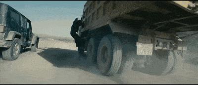 还坚持自己做高难度的动作,从并弛的两辆车之间跳过去。