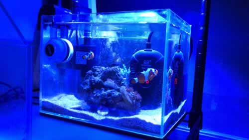 一般说到海水缸,蛋白质分离器是必不可少的过滤设备,但是我们这个是很小的一个缸,只为了饲养一对小丑鱼,而且日常产生的有机杂质并不多,完全可以通过换水来维持,所以,蛋白质分离器可以省去不用,直接用一个外挂的瀑布过滤就可以了。既提供了过滤又兼具了造流的功能。并不建议使用内置过滤器,缸本身就小,内置过滤器太占地方。