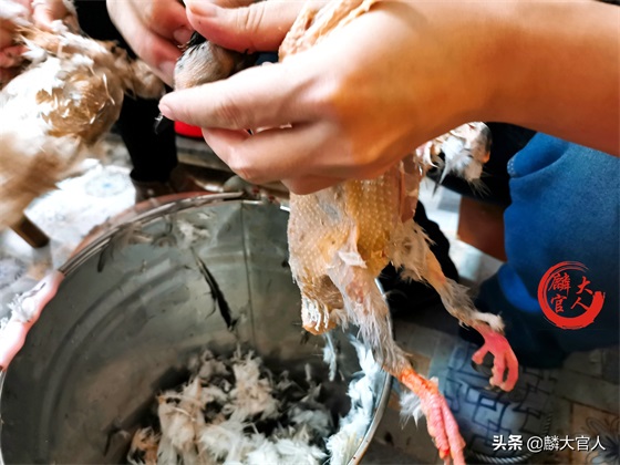2、鸽子放完血后将其放入桶内,加入适量热水,用手拔光鸽毛并清洗干净。——(注意,这里操作和杀鸡去毛同理,但是水不要太烫,拔毛时要拿起来避免鸽子肉烫老);