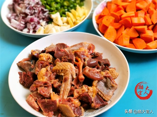 1、按照上面的方法宰杀处理好鸽子以后,切点葱姜片、胡萝卜丁、洋葱末、线椒圈以及少许香葱末;