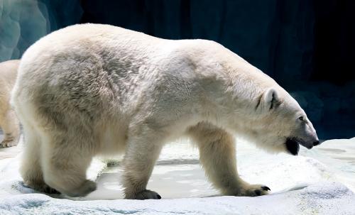 北极熊是世界上最大的陆地食肉动物,它的体型巨大,异常凶猛。它的视力和听力与人类相当,但它们的嗅觉极为灵敏,是犬类的7倍;奔跑时最快速度可达60km/h,就连世界百米冠军都不如,它们通过比犬类发达十倍的嗅觉发现海豹的踪影,在冰面上追逐,接近目标后双掌一插,十几厘米厚的冰层马上被击穿一个洞