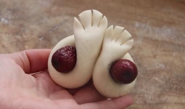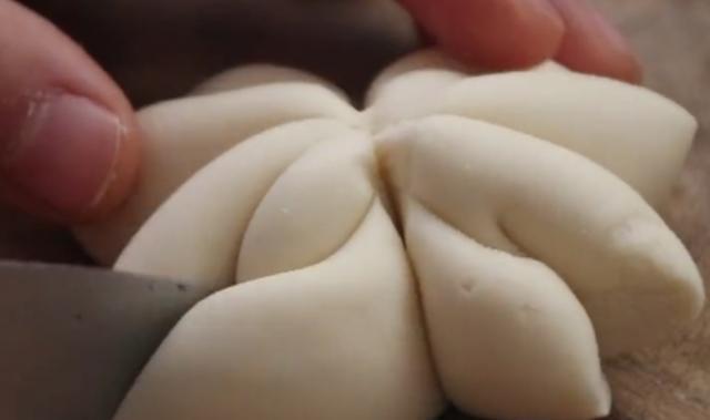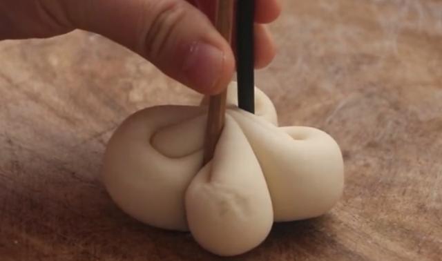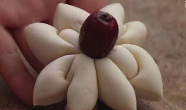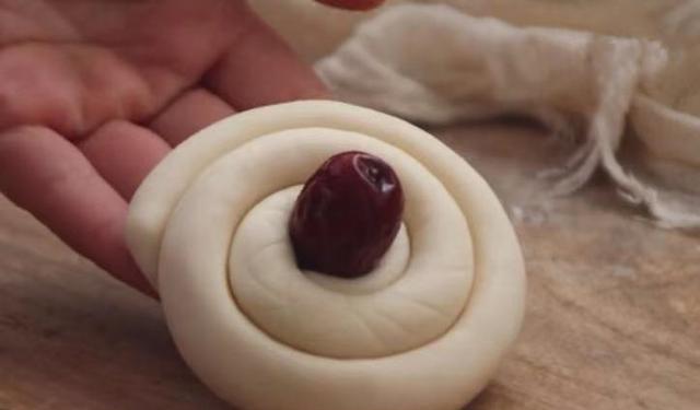 花馍4、再做一个其它的花形,先把面团搓成长条,再从两边往相反的方向卷,再用筷子在中间夹一下,夹完之后再把四边切一下,在中间的位置放上一颗红枣,一个生坯就做好了。