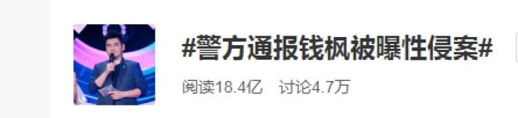 抽取新浪微博近期网友热议的两个话题,#刘雨昕道歉# 阅读数4.7亿,讨论数10.4万,#警方通报钱枫被曝性侵案#阅读数18.4亿,讨论数4.7万,传播数据非常惊人>