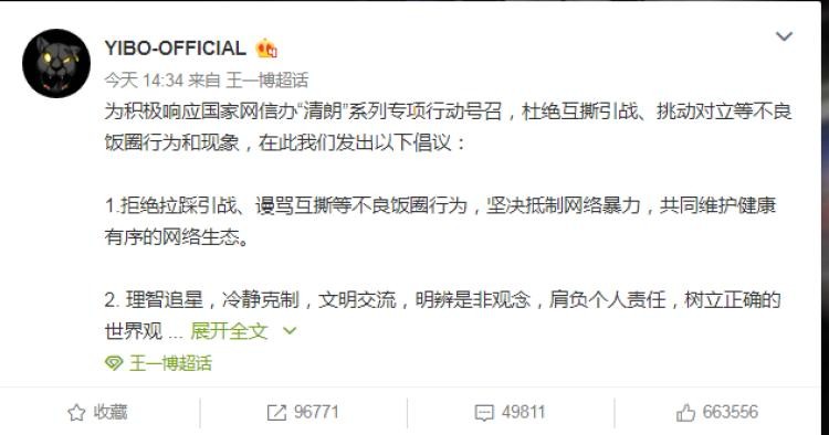 近日,国内频频发生“翻车”事件的明星艺人们让大众对其之前的完美“偶像”人设产生质疑。8月25日,王一博微博@YIBO-OFFICIAL 发文,倡议大家理智追星。在微博当中,发出倡议内容包括: