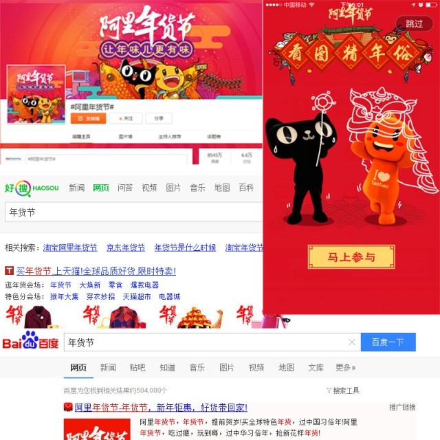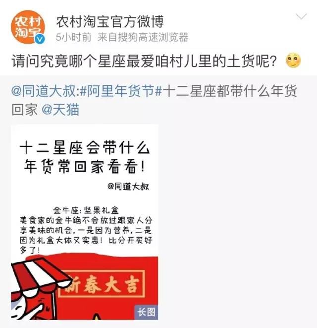 新浪微博专题、淘宝、天猫客户端报头、支付宝首页轮播广告位都是年货节的!@农村淘宝、@淘宝、@天猫等官方微博发微博,SNS社会化营销6到飞起。